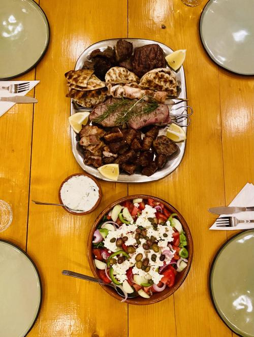Your evening kicks off with a welcoming cheese plate featuring some of the island's finest local cheeses, paired with artisan bread and seasonal delights. As the night unfolds, the grill comes to life with a mouthwatering selection of Naxos’ best meats, perfectly seasoned and cooked just for you. Alongside, enjoy a fresh greek salad, golden fried potatoes, warm pitas, and a variety of homemade sauces bursting with flavor.